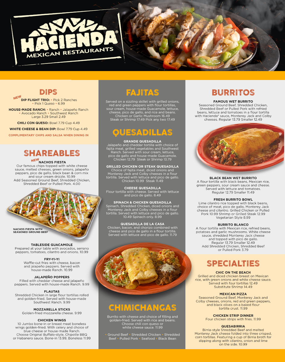 Hacienda Mexican Restaurants offers a menu rooted in approachable Tex-Mex classics and hearty Mexican favorites, designed for casual dining and relaxed gatherings. Whether you’re stopping by for a simple lunch or enjoying an evening with friends over drinks, the menu balances comforting flavors with lively, familiar options.